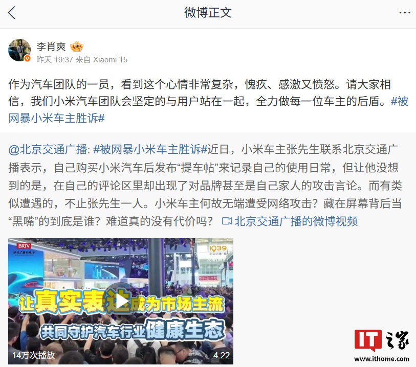 IT之家 9 月 24 日消息启远网,北京交通广播昨日分享了“被网暴小米车主胜诉”的事件。据称,小米车主张先生在购买小米汽车后发布“提车帖”记录自己的日常,但他的评论区却出现了对品牌和自己家人的攻击言论。同样遭受攻击的另一位车主邓女士拿起了法律武器,最终法院判定攻击者需要向其赔偿并道歉。