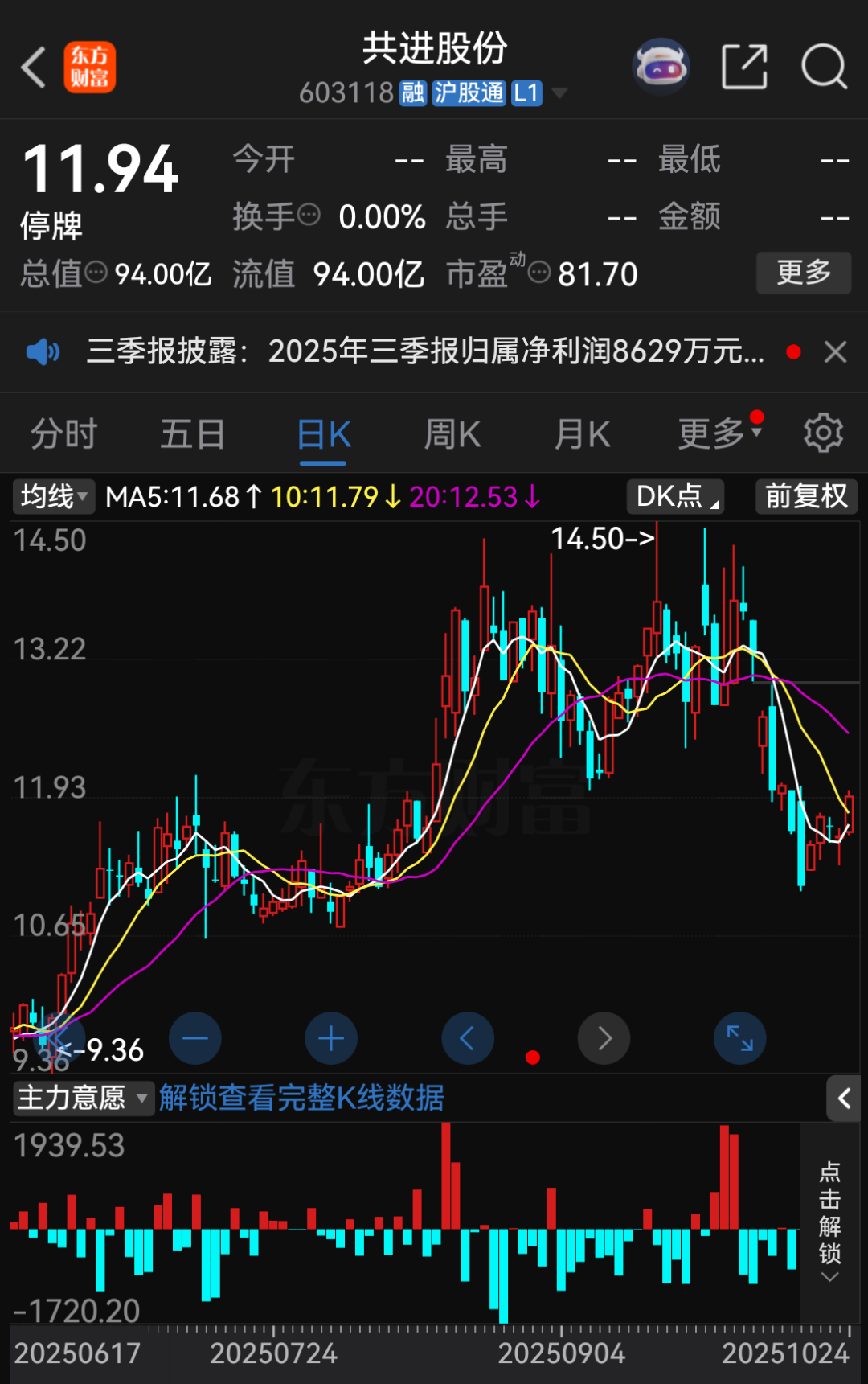 共进股份自10月27日开市起停牌,计划自11月3日开市起复牌。截至10月24日收盘,共进股份股价报11.94元/股,涨幅达3.2%,总市值为94亿元。