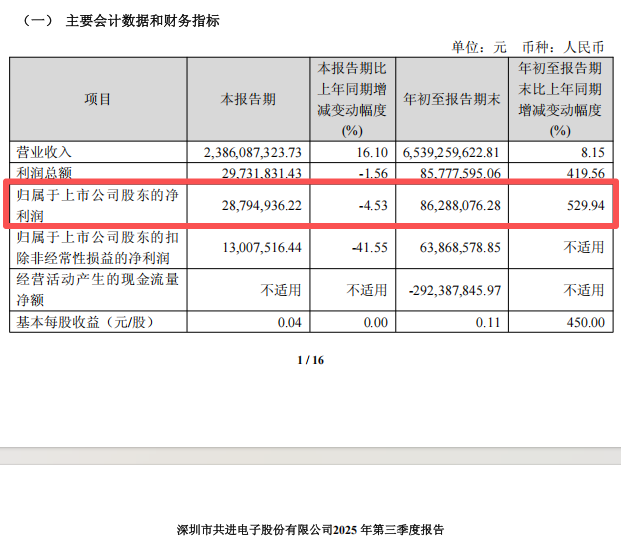 2025年前三季度,共进股份的营业收入同比增长8.15%至65.39亿元,归母净利润同比增长529.94%至8628.81万元。