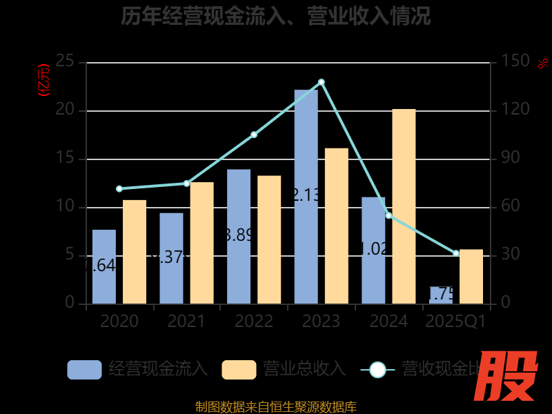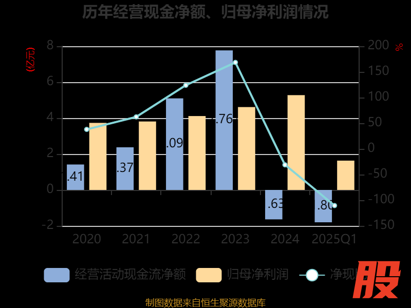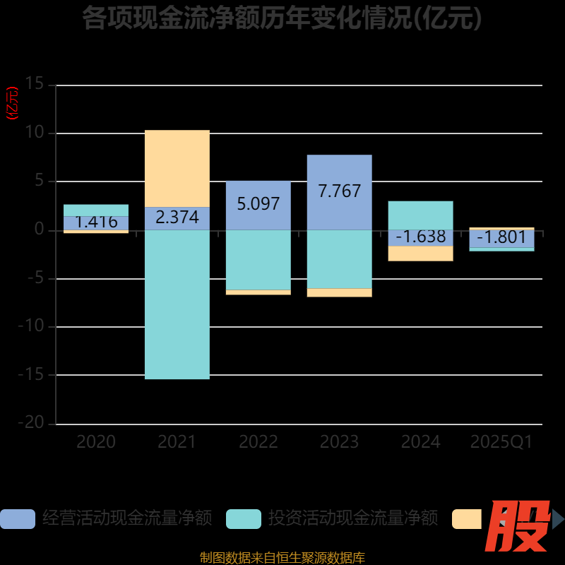 截至2025年一季度末,公司经营活动现金流净额为-1.8亿元,同比减少1.49亿元;筹资活动现金流净额2720.73万元,同比增加7807.55万元;投资活动现金流净额-3867.18万元,上年同期为-656.33万元。